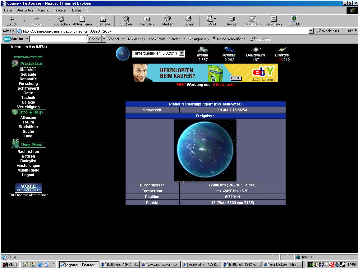 Ich besuche euer BF Forum regelmäßig und bin heute auf den Ogame Teil gestoßen. Ich bin im 5 Universum Aktiv und habe vor ca. 2 Jahren auch schon in Uni 4 gespielt und habe deshalb auch schon viele Erfahrungen in diesem Spiel gemacht. Mein Punktestand ist derzeit bei Null aber ich hoffe ihr werdet mich trotzdem aufnehemen. Wenn nicht, isses nicht so schlimm dann würde ich später mit 1000 Punkten einfach nochmal mich Bewerben.