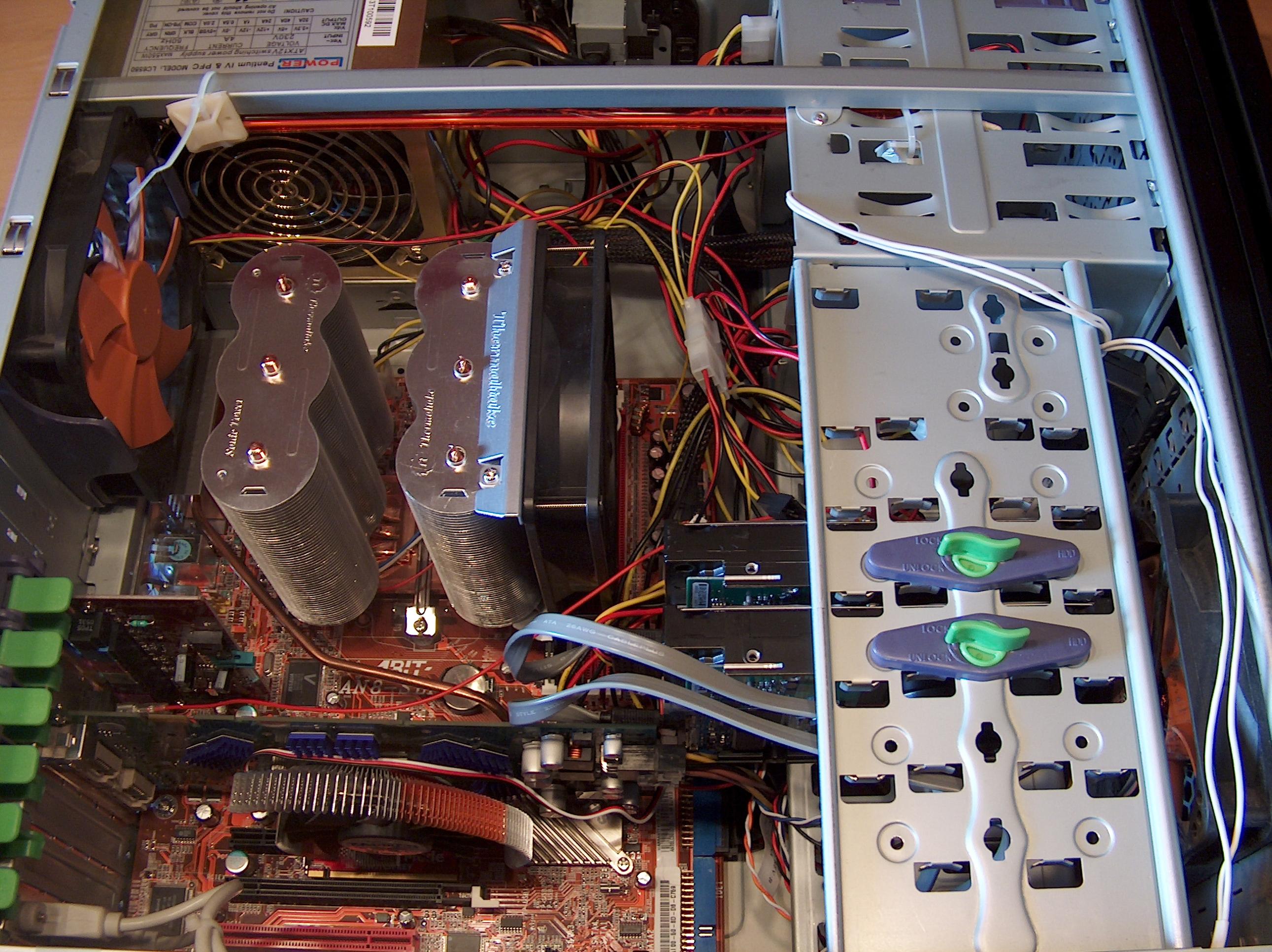 nOoKiE 0 Melden Geschrieben 4. März 2006 Soll die Turbine dort unten Luft spenden ? sieht nach selfmade hdd kühlung aus. ?: ist das da hinten eigentlich ein 60er lüfter? da passt doch locker ein 120er hin. schwing die stichsäge und mach da n loch hin, dann ahst du ein gut belüftetes case 60er Lüfter? Keine Ahnung ! Zur Turbine muss ich sagen, dass sie sehr effizient ist! Blöde nur daran ist, dass sie halt viel Staub mit reinzieht...hab einfach ein großes Plastikrohr genommen, angepasst und mit gelben Klebeband fixiert. Demnächst werde ich mal nach einem guten Gehäuse und natürlich nach ein paar LEDs schauen ! Mit freundlichen Grüßen nOoK!E