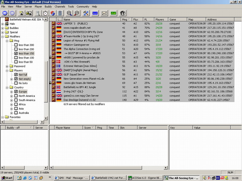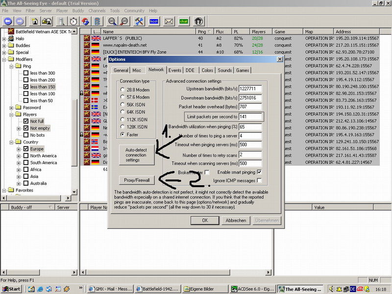 Bullway 0 Report Posted July 22, 2004 Also du musst auch in BFV Punkbuste aktivieren,und im ASE Menü kannste die Option keine Vollenserver zeigen wählen (An der linken Seite etwas runter scrollen und dann unter players not emty und not full einen Hacken rein dann zeig er keine Leeren und keine Vollen Server an),ausserdem ist es gut eine Pinggrenze für die Server festzulegen(wieder links runterscrollen und unTer Ping den Gewünschten wert einstellen ich hab zum Beispiel 150 als Wert festgelegt somit werden keine Server mit einem Höheren Ping angezeigt)