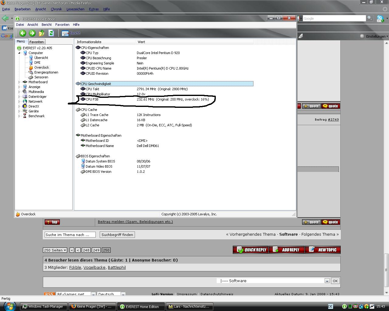 Fckble 0 Melden Geschrieben 9. Januar 2008 everest home ist bescheiden, gugg mal was cpu-z sagt eigentlich müsste der Multi 14 sein und der FSB 200 es kann sein das der Pentium D schon das Feature hat, dass der Mutli bei geinger Beanspruchung runter geht um Energie zu sparen. Allerdings sollte der FSB nicht hochgehen. Der Multi wecheselt immer zwischen 12-14 was meint ihr könnte ich da noch mal nen bisschen was rausholen? Bus Speed :199,5Mhz Rated FSB 795mhz
