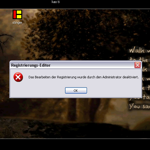 Steffen87 0 Report Posted August 12, 2004 Ich hoffe ihr könnt mir helfen: Ich habe Windows Xp Pro. Wenn ich unter Start - Ausführen "regedit" (Registrierungseditor) eingebe gibt er mir ne Fehlermeldung (siehe angefügtes Bild). Ich habe aber Admin-Rechte und es ging auch schon mal... Vielleicht hatte das problem schon mal jemand, was ich zwar nicht glaube, aber trotzdem schonmal danke für die Antworten