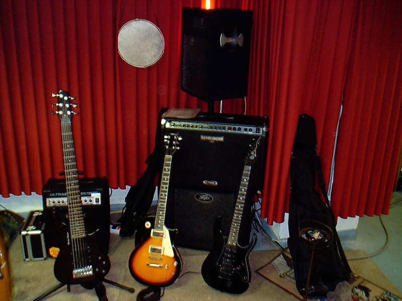 hier mal ein paar gitarren. die schwarze ibanez rechts is meine. der 6-saitige e-bass auf der linken seite is ein ziemliches killer-teil, ma nix für ungeübte B)