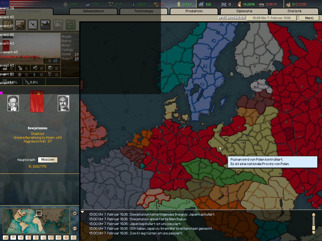 T4CT1C 0 Melden Geschrieben 28. April 2006 (bearbeitet) Putschen und dann neu als CSA laden und dann Texas, Kalifornien, blah... in die Unabhängigkeit entlassen wäre auch noch ne Möglichkeit... Hab auch grad ein neues Game laufen, diesmal mit den Russen... Total ahistorisch is das Ding gelaufen... Italien trat noch zu Friedenszeiten der Achse bei, kurz vorm Frankreichfeldzug auch noch Portugal und Spanien... Die Achse hat Frankreich in nichtmal 2 Wochen eingesackt... Bulgarien hat die Türkei annext und die Jugos und Griechen haben ein Bündnis geschlossen, nur greift die Achse nicht an... Wir haben nun Herbst '42 und mir wird langsam langweilig... Adolf is ne feige Sau und kneift... Er sammelt lieber mit dem Duce afrikanische Provinzen ein... Nordafrika gehört so ziemlich ganz Italien (ausser die Vichygebiete und ein Fetzen von Marokko wo die Alliierten Divisionen stapeln... Alles südlich des Äquators wird von starken deutschen Verbänden bedrängt, die stehen schon an der südafrikanischen Grenze... Total überrascht war ich aber vom Nahen Osten... Irak ist unabhängiger Faschist und Syrien wollte die Engländer ankacken... War ein Fehler... Naja, mittlerweile wird dort ohnehin Pizza gebacken... Japan versagt mal wieder in China und kommt einfach nicht vorwärts... Naja, dann müssen sich meine Truppen später wenigstens keine Blasen laufen... Pünktlich am 1. Januar 1943 werden alle meine Einheiten upgegradet sein und das "Großer Vaterländischer Krieg"-Event wird wohl auch noch bis dahin triggern... Dann hau ich mit meiner 350 Divisionen starken Bärentatze mal gen Westen... In 4 Wochen bin ich in Berlin... Bearbeitet 28. April 2006 von T4CT1C