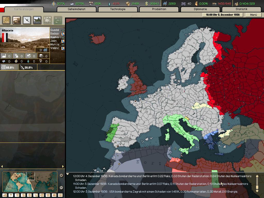 Sergio 4302 Autor Melden Geschrieben 17. Dezember 2007 So, Norwegen und Ikealand sind nun geschichte, werd jetz erstmal auf Flugzeugträger Forschen, da Schlachtschiffe nich mehr wirklich was reißen ... Die A-Bombenproduktion läuft gut, nen voll ausgebauten Reaktor in Berlin un einen auf 6 in Frankfurt/Main. Denke mal als nächstes wird die Türkei dran kommen, der der Tommy letztens schon versucht hat von da in mein Reich zu komm. Ma gucken, Forschungen sind auch nich mehr so viele da