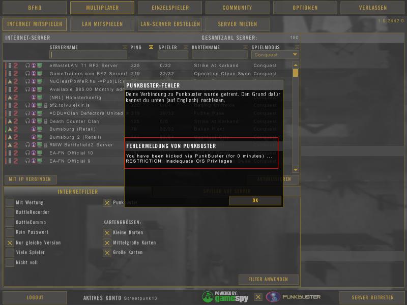 Manitou 0 Melden Geschrieben 9. August 2005 deine fehlermeldung lautet "inadequate os privileges" das ist der große mist an punkbuster, das es nur unter dem administrator konto läuft! ich selbst arbeite auch nur als hauptbenutzer und windows und muss mich dann immer ummelden, wenn ich mal im i-net zocken will. also dein problem besteht darin, dass du admin rechte brauchst um bf zocken zu können (im i-net) was mich persönlich schon lange aber man muss sich ja den anforderungen unterordnen also, als admin anmelden und loszocken