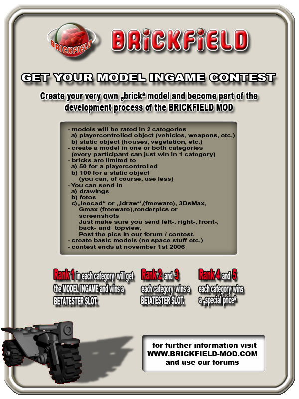 funakistyle 0 Melden Geschrieben 3. Oktober 2006 02.10.06 Brickfield: Großer Model-Wettbewerb Die Entwickler der Lego-Mod Brickfield (BF) haben seit gestern einen Contest der besonderen Art auf ihrer Website ausgerufen. Im Rahmen eines Contests haben Fans die Chance eigene Arbeiten einzureichen und diese mit ein wenig Glück in der Mod zu sehen. Bis zum ersten November können in den Kategorien Static und Player Controlled Object (PCO) Zeichnungen, Fotos oder Render eingesandt werden. Unter einem Static versteht man statische Objekte wie ein Haus oder Teile der Vegetation, in den Bereich PCO fallen Waffen und Fahrzeuge. Mit Freeware zum Ziel Wer weder zeichnen noch fotografieren möchte, kann sich auch direkt an einem Freeware-Programm versuchen. Die Entwickler empfehlen Ldraw, Leocad und Gmax als nutzbare Programme, allerdings ohne weitere Erklärung zu dessen Nutzung. Über bekannte Suchmaschinen finden sich allerdings ausreichend Tutorials. Regeln und Rahmenbedingungen Arbeiten können noch bis zum 1. November dieses Jahres eingesendet werden. Eine Einsendung erfolgt über das Forum der Mod. Für die Arbeiten gelten zudem besondere Richtlinien: Statische Objekte sollten aus nicht mehr als 100 Legosteinen bestehen, die Grenze für PCOs liegt bei 50. In der Kategorie Render (LDraw/Gmax) werden zudem die fünf Perspektiven vorne, links, rechts, hinten und Draufsicht verlangt. Preise, Preise, Preise Weil eine Mod keine Gelddruckmaschine im Keller stehen hat, sind die Preise des Contest auf die Zielgruppe zugeschnitten: das Modell auf Platz eins in den beiden Kategorien findet seinen Weg ins Spiel, zusätzlich wird der Modeller zum Betatester. Die Plätze zwei und drei erhalten ebenfalls einen Platz im Betatest, für die Positionen vier und fünf soll es einen Spezialpreis geben. Die Brickfield Devs haben diese Aktion laut eigenen Angaben gestartet, um der Community eine größere Rolle in der Entwicklung von Brickfield zukommen zu lassen.