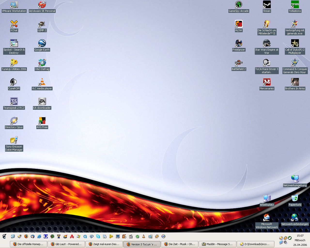 Vestalis 1 Melden Geschrieben 28. April 2006 ungekürzt: http://img140.imageshack.us/img140/9721/unbenannt2nv1.jpg - is zu groß fürs Forum (2432x1024).... Zwei Monitore einer 1280x1024 der andre 1152x864 - deswegen die verschiebung - linkes WP is von mir ... sieht kagge aus, ich weiß, sollte es aber für die beiden die drauf sind machen .... und da ich erstmal n WP brauchte dacht ich nehm ich mal mein eigenes