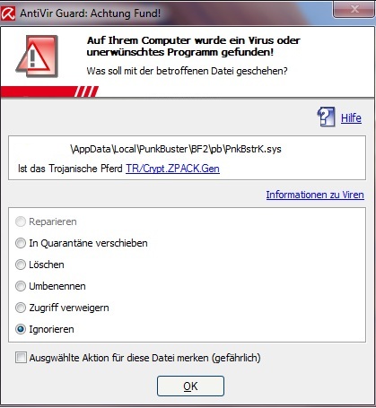 Xstrike24X 0 Melden Geschrieben 15. Juli 2009 Also es ist auf jeden Fall kein Virus/Trojaner. Einfach zulassen und nach dem nächsten Antivir Update wird es nicht mehr zu dieser Meldung kommen. Ich schau mal schnell bei mir rein ob meiner auch drauf anspringt... aber mir fehlt ja schon diese datei PnkBstrK.sys ...was hat des denn zusagen