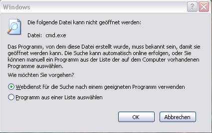 Monoman 0 Report Posted January 27, 2006 Oder geh' mal im Dialog aus deinem letzten Screenshot auf "Programm aus einer Liste auswählen...". Dann suchst du das Programm "command.com"; das befindet sich normalerweise im Ordner %SYSTEMROOT%/system32/.