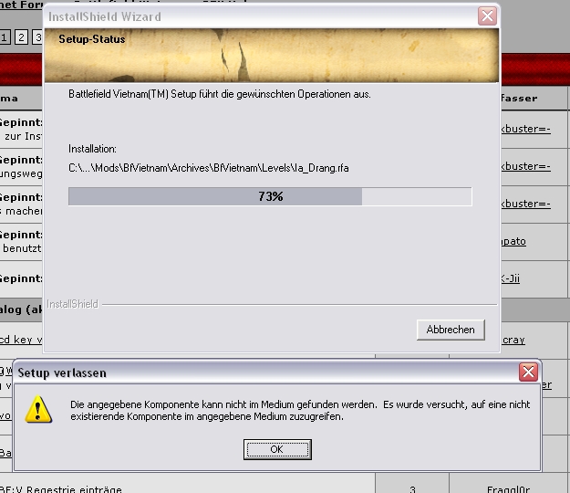 bowski 0 Report Posted August 30, 2006 Hallo ich hab BFV nun schon kurz nachdem es rausgekommen ist, hatte es auch schon 1 , 2 mal installiert und gespielt, dann war mein pc im arsch und ich musste alles runterschmeißen, meine grafikkarte(ati radeon 9700 Pro) hat danach keine treiber mehr erkannt und ich konnte halt nun 1 jahr kein spiel mehr spielen, dann hab ich letzte woche das problem mit der grafikkarte behoben(und spiele wie GTA San Andreas , Splinter Cell Pandora Tomorrow und Need for Speed Most Wanted laufen ohne problem) und wollte heute halt BFV installieren, also am anfang läuft alles perfekt : cd 1 rein, cd key eingeben ,usw, nachdem ich die 2 cd eingelegt habe und die installation bei 73% ist kommt folgende fehlermeldung danach drück ich halt ok und das installations menü beendet sich. was soll ich nun tun? hoffentlich könnt ihr mir helfen vielen dank im vorraus bowski