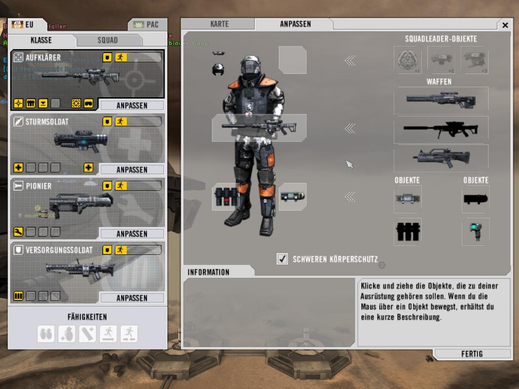 Cyborg11 186 Autor Melden Geschrieben 31. Oktober 2006 Im "Anpassen" Menü, dort wo man seinen Soldaten Ausrüsten kann, in einen freien Block ziehen. Ich glaube es war in einem der unteren, welcher der unteren ist eigentlich egal. Na das ist ja das Dumme, das kann man net auswählen oO Die 4 Ausrüstungen sind nur: - C4 - Minen - Gruber - Unsichtbarkeitsgerärt Aehm... wenn du mit Rechtsklick zoomst kannst du mit dem Mausrad glaub ich die Zoomstufe einstellen. Allerdings nur wenn du Waffewechseln auch auf dem mausrad hat. Ah ok danke, probier ich mal =)