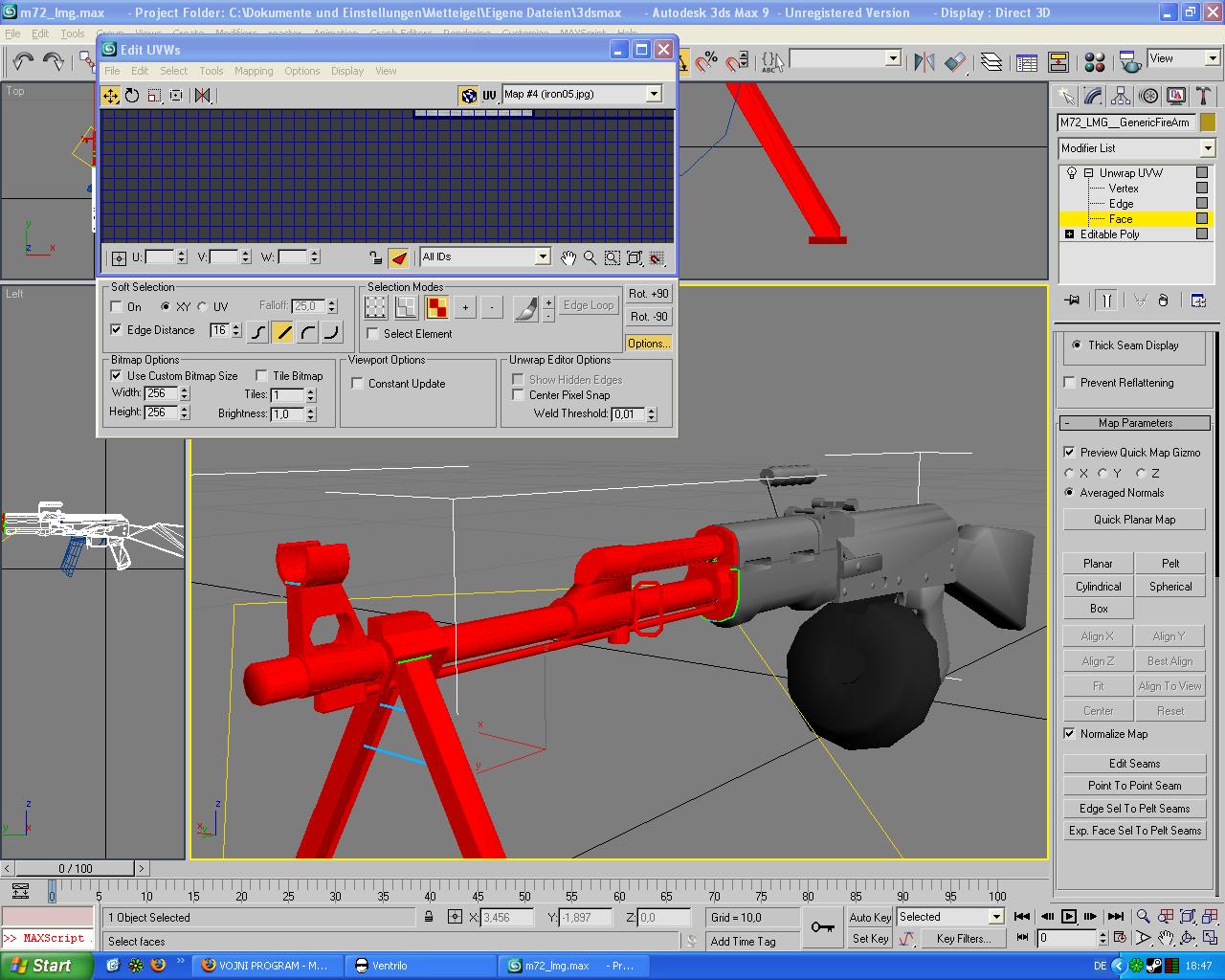 metteigel 0 Report Posted January 17, 2007 Hi habe eine SEHR WICHTIGE Frage!!! So ich habe ne Waffe wo ich in einen bestimmten (auf dem Bild den Roten) Bereich einen Textr machen will. Habe auch schon ein UVW dafür gemacht. Nur wenn ich die Textur draufziehe ist die ganze Waffe so, außer das Magazin. Das wird daran liegen, weil die ganzen Sachen mit attach zusammengeführt wurden. Was kann ich machen!