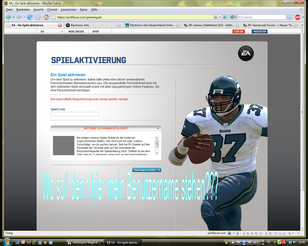 Ironman182 0 Melden Geschrieben 21. September 2007 Hallo alle zusammen, ich habe mir heute den Boosterpack für Battlefield 2142 gekauft. Bin auf den EA.Link gegangen, hab den Code eingegeben. Danach kam ein neuer Bildschirm in dem irgendwas von Kontozusammenführung gefaselt wurde. Habs gemacht und bin dann auf die Suche nach dem Download des Boosterpacks gegangen. (Der EA.Link heißt jetzt EA Store, wenn ich das jetzt richtig verstanden hab) Hab mich bei dem EA Store angemeldet, dann kam nur nochmal ein Eingabefeld in dem ich meinen Aktivierungscode eingeben musste. Da hab ich dann die Meldung erhalten, dass der Code bereits genutzt wird. Weiter steht da, dass ich soll ich unten meinen anwählbaren Benutzernamen auswählen (Bild im Anhang), aber da steht nichts und ich kann mich auch nicht in dem Store anmelden. Wär toll wenn mir jemand von euch darauf ne Antwort geben könnte, da ich ja anscheinend das ohne Hilfe nicht hinbekomm.