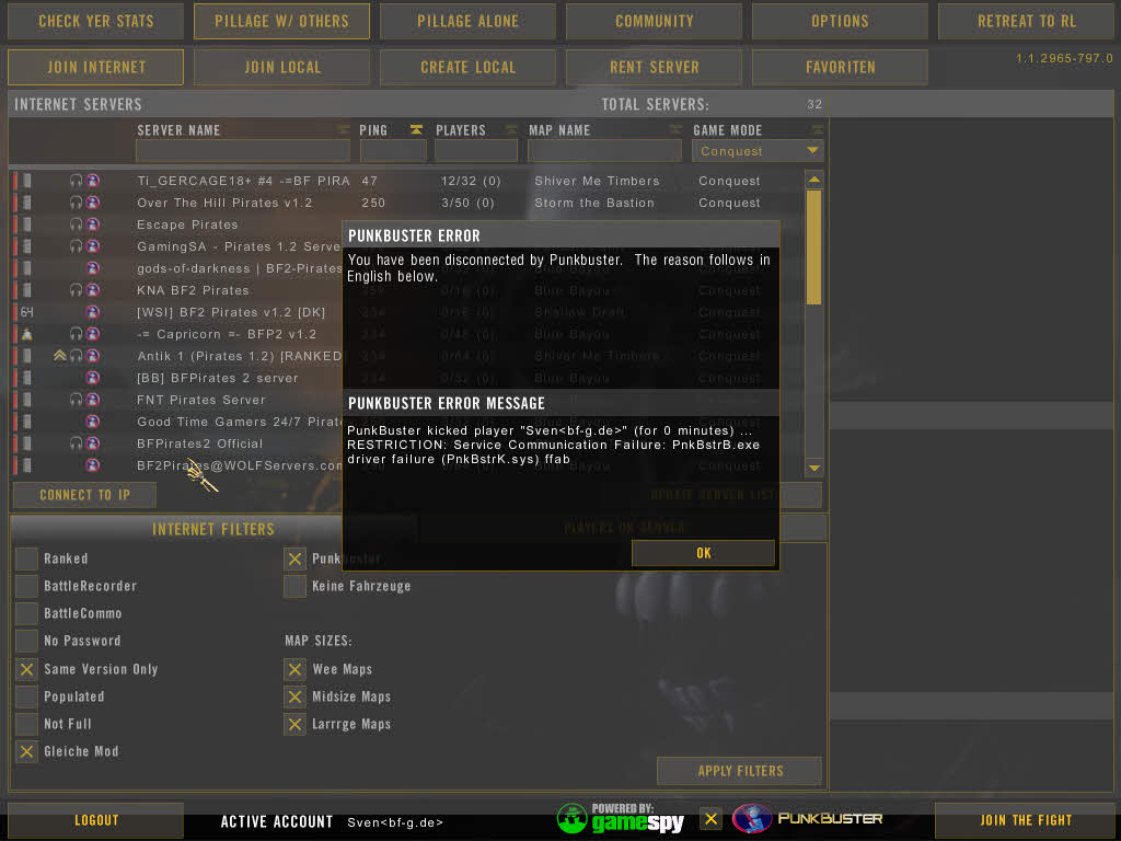 Sven 134 Author Report Posted October 26, 2007 Der A-Dienst hatte auch immer noch die gleiche Versionsnummer, ich wollte nur 100% sichergehen, daß alles runter ist. Bei mir ging es seitdem ohne Probleme, nur daß ich nachdem wir unseren Communityserver auf Pirates umgestellt hatten und dieser lange nicht gelaufen ist, mich Punkbuster von dort mehrmals gekickt hat, weil die Serverversion noch nicht aktualisiert war. Er hat mich gekickt, weil die Versionen unterschiedlich waren (unabhängig davon welche die aktuellere ist), offensichtlich wird nur die Versionsnummer geprüft, es wird nicht geprüft, ob die Version des Servers niedriger ist, als die des Clienten.