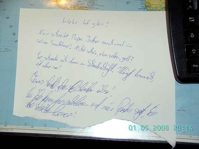Chuck Norris 123 Melden Geschrieben 1. Mai 2008 So, nun bin ich auch mal dran! Da der Scanner von meiner Madam rumspackt, haben wir den Schrieb mal geknipst! Here it comes! €: Ich sehe gerade, dass ich so schief geschrieben habe, das lag daran, dass ich das Blatt zur Lichtquelle hin drehen musste/€