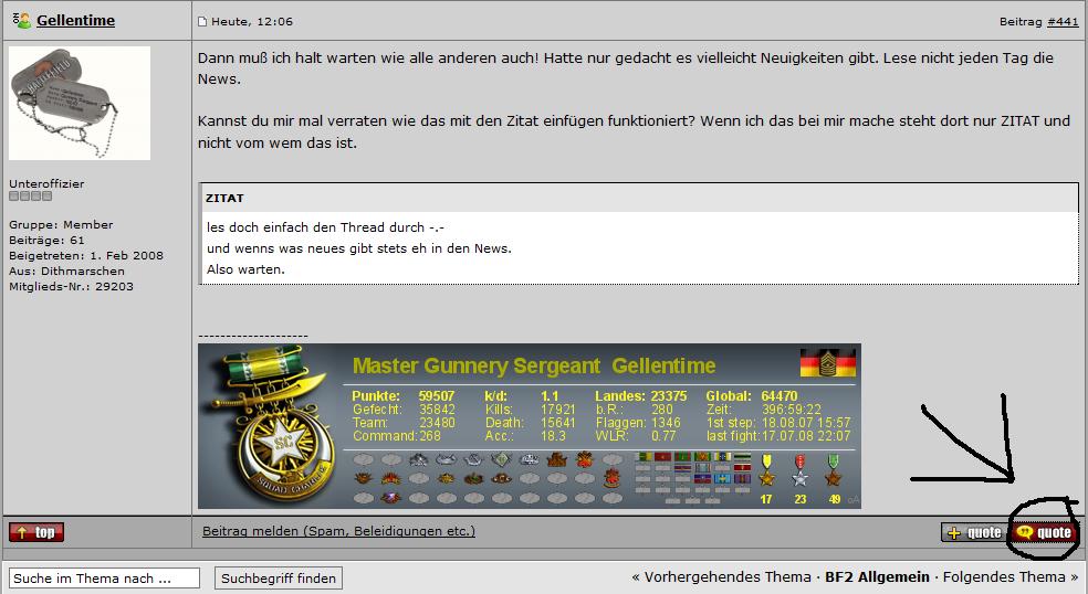 Gast The Wraith Melden Geschrieben 19. Juli 2008 Dann muß ich halt warten wie alle anderen auch! Hatte nur gedacht es vielleicht Neuigkeiten gibt. Lese nicht jeden Tag die News. Kannst du mir mal verraten wie das mit den Zitat einfügen funktioniert? Wenn ich das bei mir mache steht dort nur ZITAT und nicht vom wem das ist. habs auf dem Bild makiert
