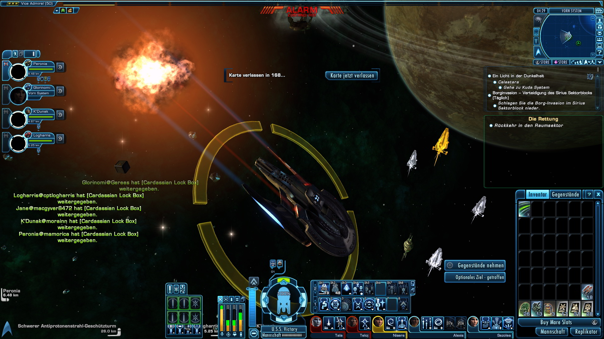 Corsair 217 Melden Geschrieben 14. März 2012 Hab Probleme mit dem Server ! Das erste mal richtige Laggs seut ich STO spiele. Und im Kampf mit den Hirogen (im Alpha Quadranten )kommen solche Laggs nicht gut. Bin jetzt dreinmal draufgegangen deswegen Hab dann letztens mit meinem Klingonen 2 Schlüssel für je 850000 gekauft ..... hab nachgeguckt. In der Tauschbörse kosten die Schlüssel ab 950.000. Heißt mir fehlen noch rund 700.000. Aber ich hab den Schwierigkeitsgrad angehoben und "finde jetzt"bessere Hardware als nur ne Energiezelle oder ne Batterie für ein abgeschossenenes Schlachtschiff.