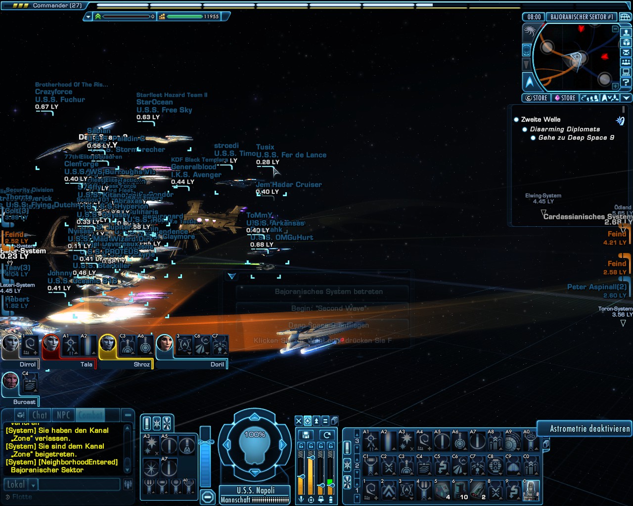 Corsair 217 Autor Melden Geschrieben 11. März 2012 Hab an so nem "Flottenqueue"teilgenommen und übel auf die Mütze gekriegt ! Hab zwar einen Teil der Aufgabe efüllt,(Erledigen sie 36 Gorn Fregatten)und hab auch ein wenig Hardware abstauben können,aber den Rest der Quest war einfach nicht zu schaffen(zerstören sie das Minenfeld und 12 Schlachtschiffe). Die Gorn Fregatten waren so ungefähr 10 - 12 Gruppen a 7 Fregatten gegen 10 Spielerschiffe Admiral Thrawn ist scheinbar auch zu Star Trek übergegaufen