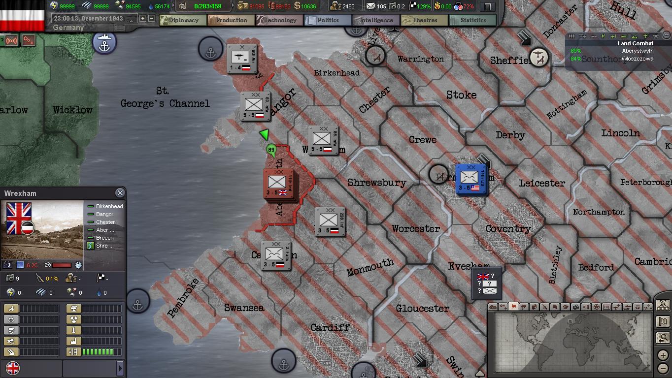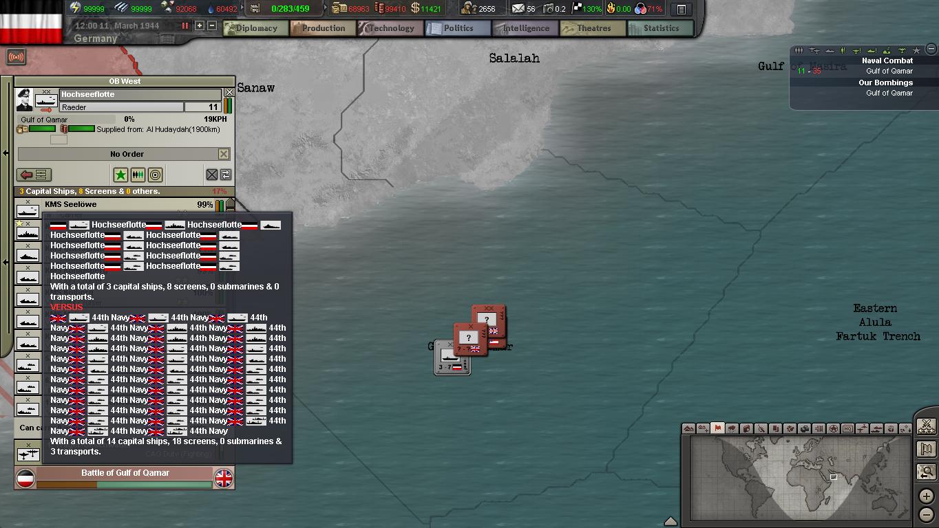 Corsair 217 Autor Melden Geschrieben 27. September 2012 Ich weiß nicht, ob du Hearts of Iron kennst... Klar ! Hab HoI II Doomsday und HoI III mit dem Semper Fi Add On. Nur krieg ich regelmäßig von der Ki den Hintern gehauen. Mache wohl irgendwas bei der Forschung falsch. Anderswo war ich allerdings etwas erfolgreicher: Und die Verluste sind auch klar Deine beiden Panzerschiffe haben Kreuzerpanzerung mit Schutz bis gegen 20.3 cm Geschützen und 12 x 28 cm in 6 Drillingstürmen. Die HMS Lion hat die Panzerung der KGV Klasse und 9 40.6 cm Geschütze in 3 Drillingstürmen die allerdings eine größere Reichweite als die 28er hatten. Und die HMS Souvereign ist ebenfalls ein Schlachtschiff welche über 8 x 38 xm in 4 Zwillingstürmen als Bewaffnung verfügt. Wenn die mich angreifen würden würde ich meinen beiden Kreuzern befehlen mit Vollgas (Dieselmotor) also rund 28.5 kn abzuhauen.