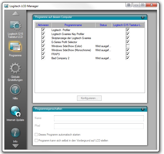 PFLO 167 Melden Geschrieben 20. Juni 2011 Habe eine G15 Refresh, seit einiger Zeit habe ich nicht mehr die normalen Programme am LCD, die ich vorher hatte. Früher konnte ich iTunes ganz normal mit den Media-Tasten bedienen, jetzt nicht mehr. Die Uhrzeit/Datum/email-Seite ist weg, Stoppuhr ebenso... Habe jetzt nur mehr Windows Side Show (Monochrome), mehr nicht mehr. Wie kann ich die alten Programme wieder anzeigen lassen? Neustarten des LCD Managers hat nichts genützt, mir werden jetzt auch nur noch diese Programme angezeigt (Anhang)