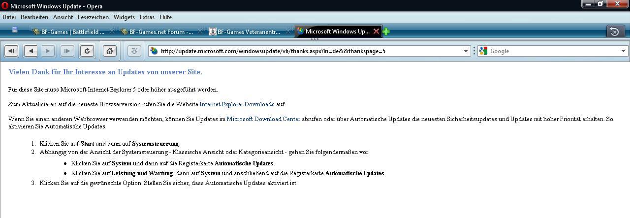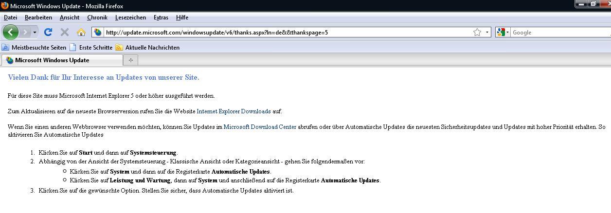 Corsair 217 Author Report Posted September 5, 2009 Wenn ich mit Opera oder Firefox ein Windows Update durchführen möchte kriege ich diese Anzeige : Wenn also dein WinUpdate nicht an den IE gebunden ist,frage ich wie du das gemacht hast ?