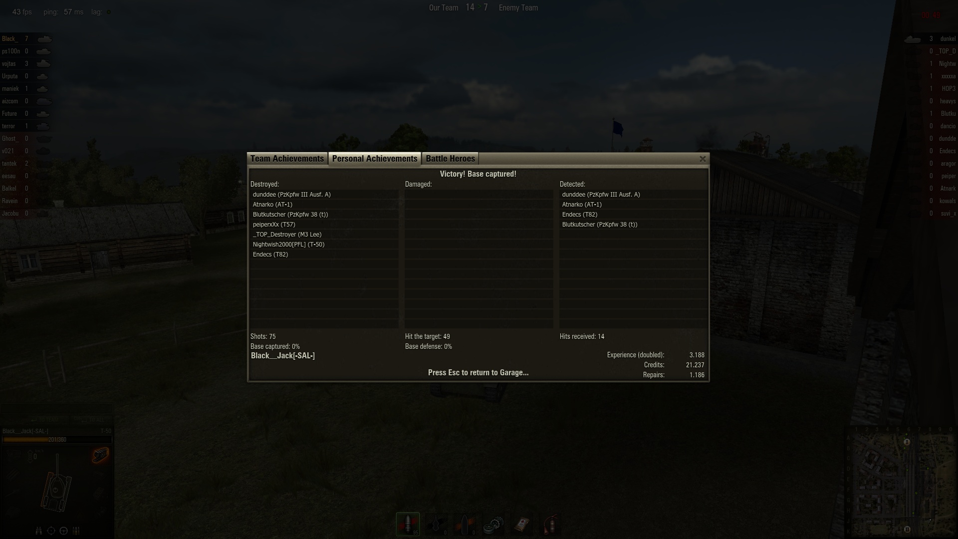 hall0 1758 Melden Geschrieben 1. Oktober 2011 So nu is wieder scout angesagt bei mir. VK2801 und T50 stehen in der garage. Um es kurz zu machen der T50 taugt mir um einiges mehr. Kann aber auch daran liegen, das ich damit bisher fast jedes battle gewonnen hab und mit dem VK neun anläufe gebraucht hab um double exp abzugreifen. (von den 9 battles 6 Campinovka ) Zum Kohle machen taugt der Vk nu leider mal gar nicht, aber zum Kohle zu verbrennen um so mehr. Wenn man ne ordentliche runde hat, macht man zwar schon ein schönes plus. Aber auf die fresse fliegt man deutlich öfter. Mal schaun ob ich dann mit der 10,5 Stummel mehr glück hab. Dann zum T50. Bei diesem tank is mir das Glück hold. Ich hab zwar noch nicht den dritten motor drin, aber trotzdem is das teil schneller unterwegs als Leo oder A20. Außhalten tut er in den minibattles auch außreichend und ich hätte sogar fast im dritten match die erste Topgun abgegriffen. Aber da mein team mich hasst, sinds wieder mal nur meine 5 geworden. (ich will endlich nen ribbon oder sonst was für 5 kills. Ich will gar nicht wissen wie oft ich diese zahl nu scho hatte ) Naja jedenfalls freu ich mich nu scho auf den T50-2 und hoffe das er bis dahin nicht total kaputt generft wurde