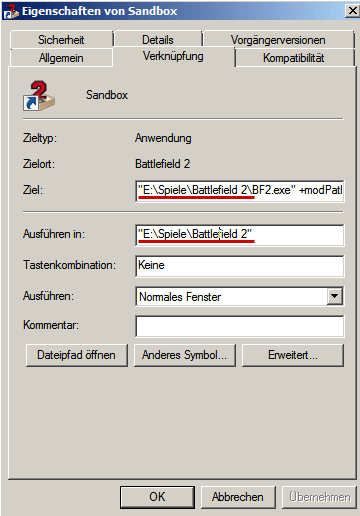 -=Punkbuster=- 166 Melden Geschrieben 17. August 2010 Kurzer Einwand: überprüfe bitte vorher folgende Eigenschaften In 9 von 10 Fällen tritt dieser Fehler auf, weil Modinstaller die Verknüpfung falsch anlegen. Ich hatte es selbst erst vorgestern wieder bei Sandbox. Die beiden Einträge müssen exakt übereinstimmen wie abgebildet, nur eben mit Deinem Pfad. Also: Ziel: "Laufwerk:\Pfad\Battlefield 2\BF2.exe" +modPath mods/poe2 Ausführen in: "Laufwerk:\Pfad\Battlefield 2\" Die meisten scheppen Installer haben bei "Ausführen in" noch \BF2.exe hinten im Pfad und dann kommt der Fehler. Einfach rausnehmen und gut ist. Wenn es das nicht ist, versuch die Methode von Kett PS. Dieselbe Überprüfung gilt für OPK. Ich sauge mal schnell POE 2.5 und schaue, was der Installer so anstellt.