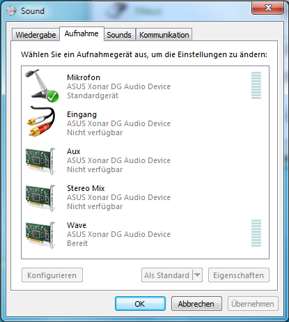 Defcon992 0 Autor Melden Geschrieben 30. Dezember 2010 (bearbeitet) ich würd mal grad frei heraus ins grüne schiessen und mal die windows mixer settings überprüfen ob da alles richtig eingestellt ist und ob da auch keine haken für Mic Mute drin sind wo keine sein sollten, danach im managerprogramm der soundkarte die selben einstellungen überprüfen Im Mixer (Lautsprechersymbol neben der Uhrzeit??) finde ich kein Symbol für Mikrofone, die Asus Kontrollsoftware hat auch keine Einstellmöglichkeit für Mikrofone. Hast du eine Onboard Soundkarte? Wenn ja, hast du die deaktiviert? Und hast du den Mikroanschluss richtig gesteckt? Im BIOS habe ich keinen passenden Eintrag gefunden und über den Gerätemanager zu deaktivieren hat nichts gebracht. Mikro ist richtig gestöpselt, gemäß den Farben. Du könntest auch die Webcam mal ausstöpseln, vllt. wird dann das Mikro des Headsets aktiv. Bei mir hilft das meistens. Habe ich gemacht ... keine Wirkung Ich habe mal einen Screenshot angefügt, vom Soundfenster. Bearbeitet 30. Dezember 2010 von Defcon992
