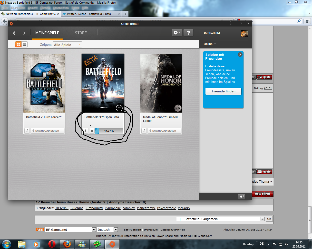 bell-brother 0 Melden Geschrieben 26. September 2011 hier ein bild für die ungläubigen^^ Warum zum geier wird mir die Beta nicht angezeigt o.O Hast du die MOH Tier1 Edition oder die Limited Edition, bzw weiß einer ob es einen Unterschied ausmacht? Hab nämlich die Tier1 und da wird auch noch nichts bei Origin von der BETA angezeigt! Muss ich nun doch Angst haben das ich morgen nicht zocken kann???