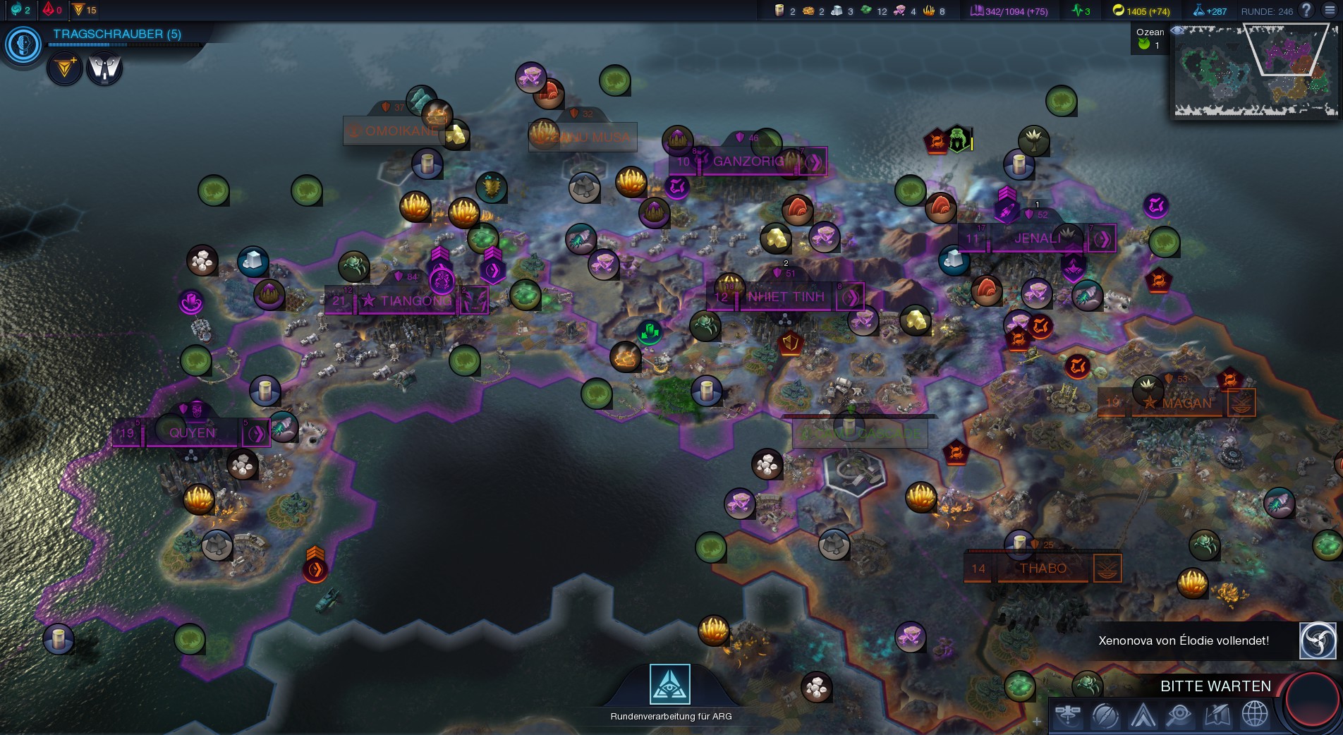Pedder 864 Melden Geschrieben 24. Oktober 2014 Erste Runde hab ich durchgesuchtet. Habe meinen Panasiatischen Staatenverbund auf dem neu besiedelten Alienplaneten zu einer überlegenen augmentierten Sky-Net-artigen Roboter-Borg Gesellschaft weiterentwickelt. Und dann habe ich ein Warpgate zur alten Erde hochgezogen um die alte Menschheit von ihrem Elend zu "befreien". Widerstand ist zwecklos. 1