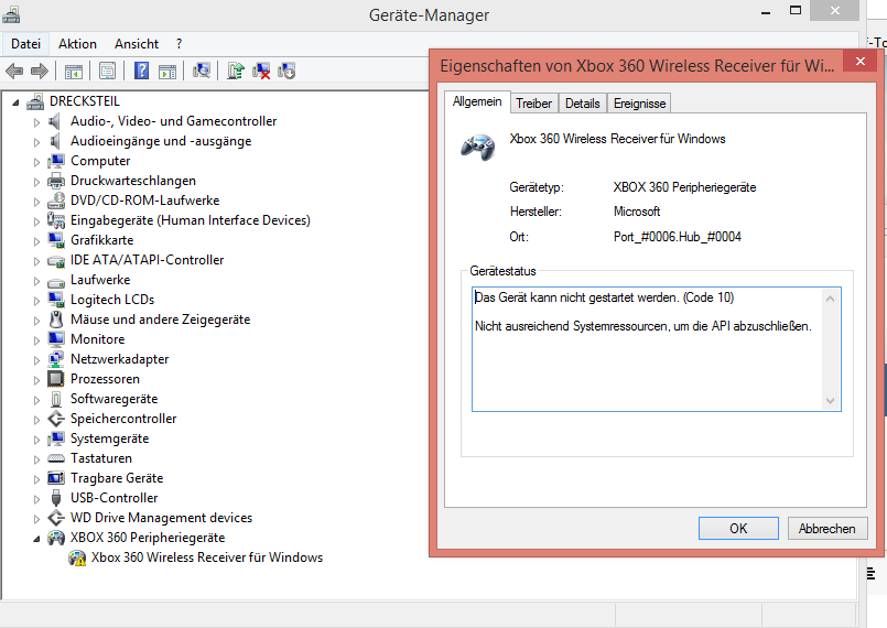 Jojokiller 5 Melden Geschrieben 28. November 2015 Hey also folgende Situation: Ich habe einen MS Xbox 360 Wireless Receiver, der nicht mehr erkannt werden will, bzw nur noch an bestimmten Ports(Usb 3.0 oder Front panal) funkitoniert und erkannt wird und das sofort. Um das Problem welches komplexer ist zu erklären muss ich etwas ausholen. Mir ist vor ein paar tagen mein Hs kaputt gegenangen , kommt vor also bei amazon ein neues bestellt, das kam heute an. Bis dahin funktionierte immer alles Headset, Maus, Tastatur, MS Xbox 360 Wireless Receiver alles an Usb 2.0 Ports. Heute kam also mein neues Headset, neues Headset reingesteckt in den Usb Port, ging auch alles bis ich auf den Teamspeak gestartet habe um mit ein Paar leuten zu zocken, dort bemerkte ich dann das die Sprachaktivierung nicht ging, also ging ich auf die Suche nach der Ursache, nach einigem hin und her hab ich dann herausgefunden das, dass Headset nur an Usb3.0 und dem Frontpanal Usb 2.0 funktioniert. Dannach habe ich alle Geräte rausgezogen und nacheinander wieder in die hinteren Ports reingesteckt, dannach ging das Headset aber der Empfänger nicht mehr. Wurde im Geräte Manager auch mit einem Fehler angezeigt(anders als das Headset). Nach dem Neustart wieder das Mikrophon problem aber der MS Xbxo 360 Wireless Receiver ging wieder. Diesen dann mal an Usb3.0/ Frontpanal ausprobiert selbes wie beim Headset dort wird er erkannt ohne Probleme. Wenn ich ihn jetzt in einen der hinteren Ports reinstecke kommt folgende Fehlermedlung im Gerätemanager(sieher Anhang), hab schon nach dem Fehler gegoogelt und es soll wohl ein Treiber fehler sein, hab auch schon versucht ihn zu Updaten ging aber nicht. Kann mir jmd weiterhelfen? System: Win 8.1 64 bit I7 3770K Gtx 970 16 Gb Ram