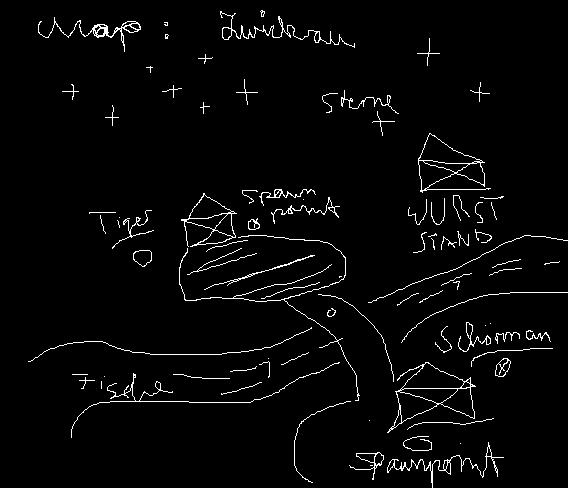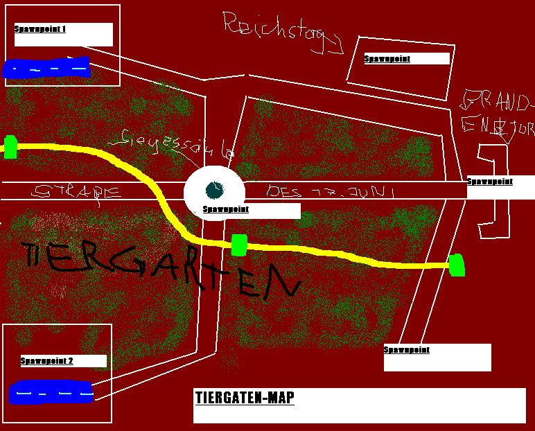 Neo 007 0 Melden Geschrieben 3. Februar 2004 Also wenn schon Vorschlag dann geb ich auch ein: Legende: Die Spawnpoints sind die Einstiegspunkte! Blaue Str. = Start Das Weiße= Straßen Grün = Baüme weil im Tiergarten gibts viele davon! DAS Gelbe = U-bahn ich dachte mir die kann man dann zur taktik benutzen! Das hellgrüne =U-Bahnstationen! Ich versuch mal ne Map in der Form zu baun.. mal sehen was draus wird!